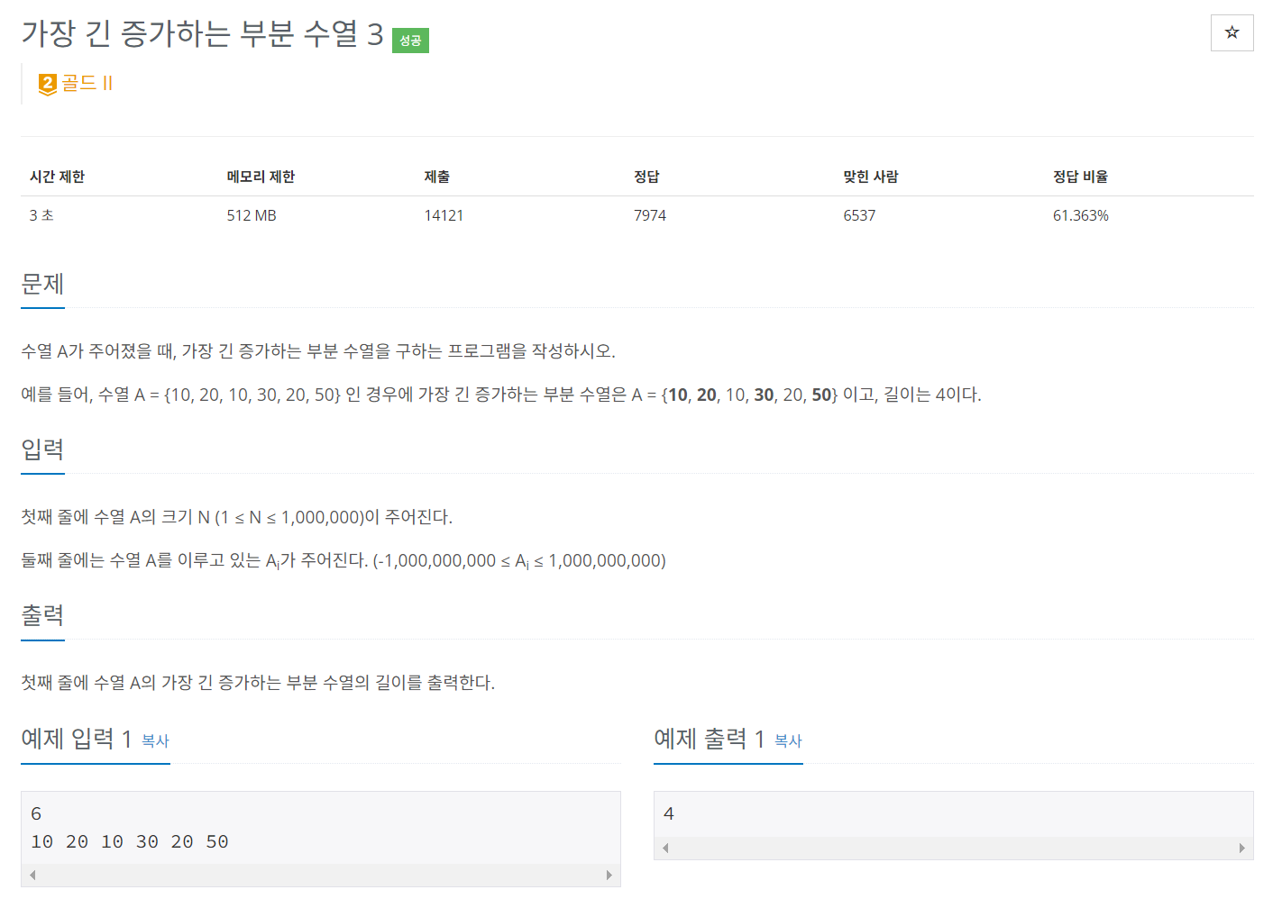 주어진 수열 안에서 가장 긴 증가하는 부분 수열의 길이를 구하는 문제 입니다.