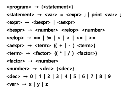 l 본 프로그램은 EBNF로 문법이 정의되는 언어를 위한 Recursive-Descent Parser를 C/C++, Java, Python으로 각각 구현한 프로그램임, 프로그램은 아래의 EBNF문법을 모두 구현함