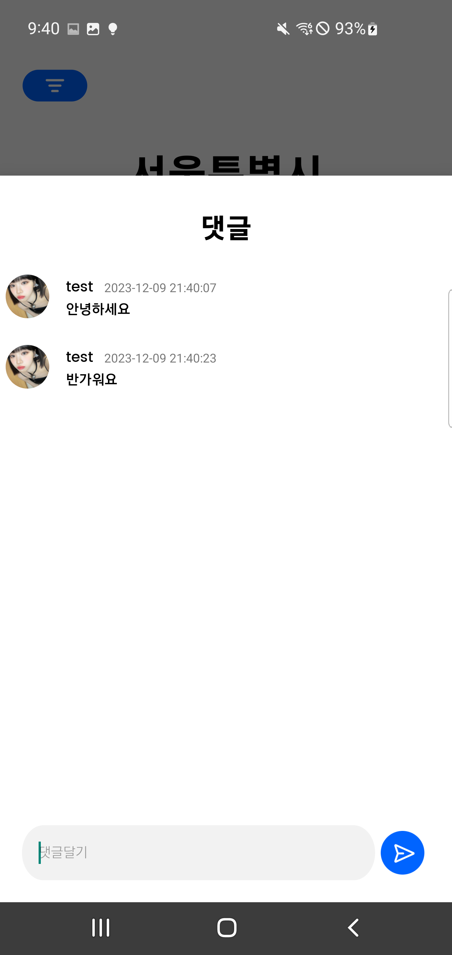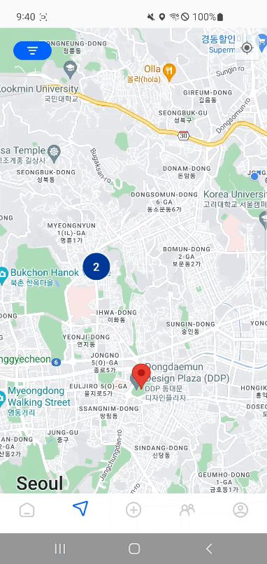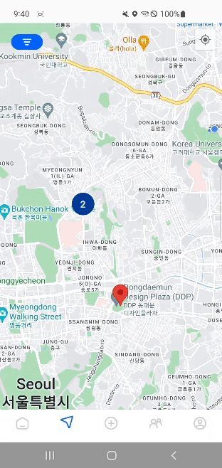 - 필터버튼을 눌러 게시물을 필터링 할수 있습니다. 지도화면과 필터 내용을 공유합니다