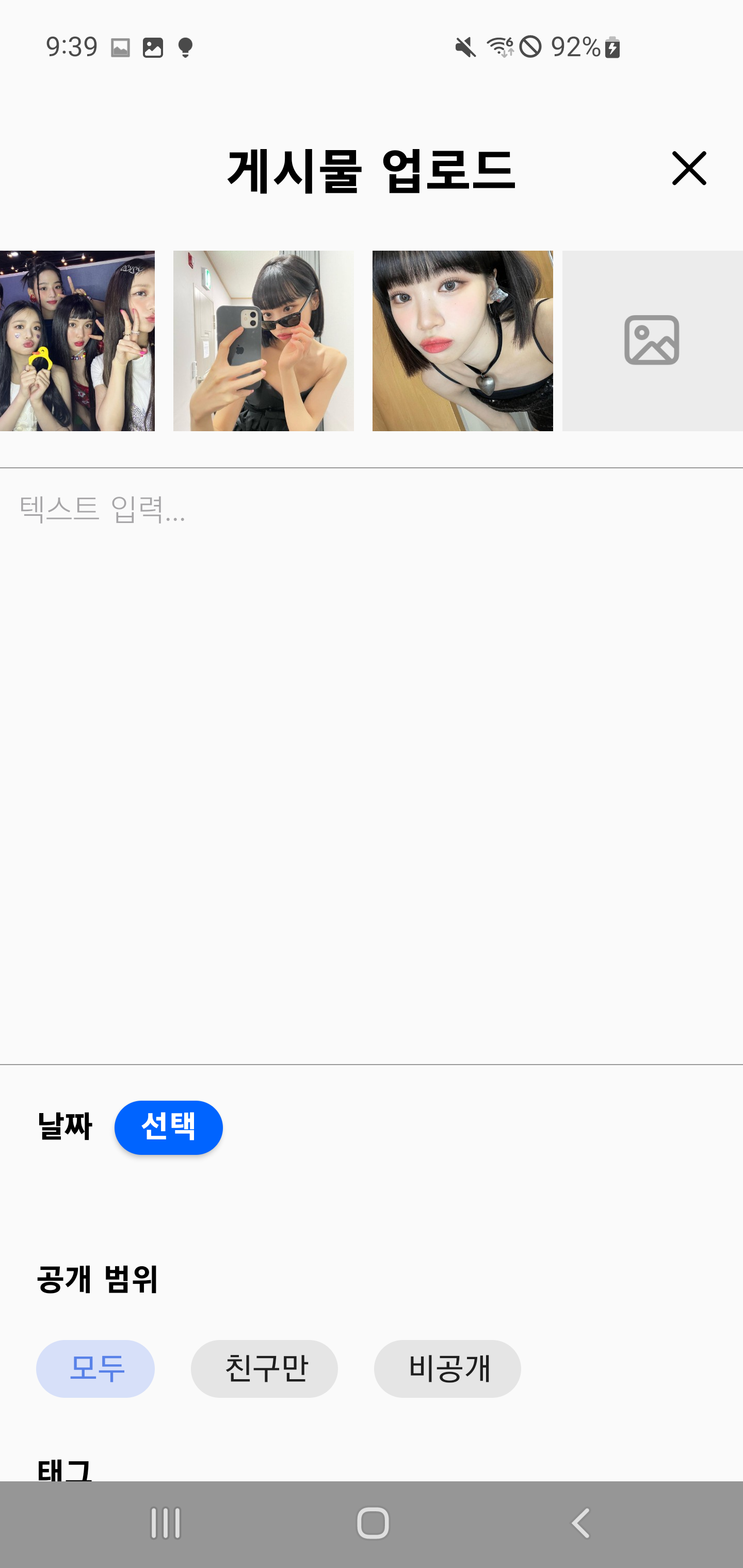 - 사진과 함께 올라갈 택스트, 날짜, 공개범위를 설정할 수 있습니다.