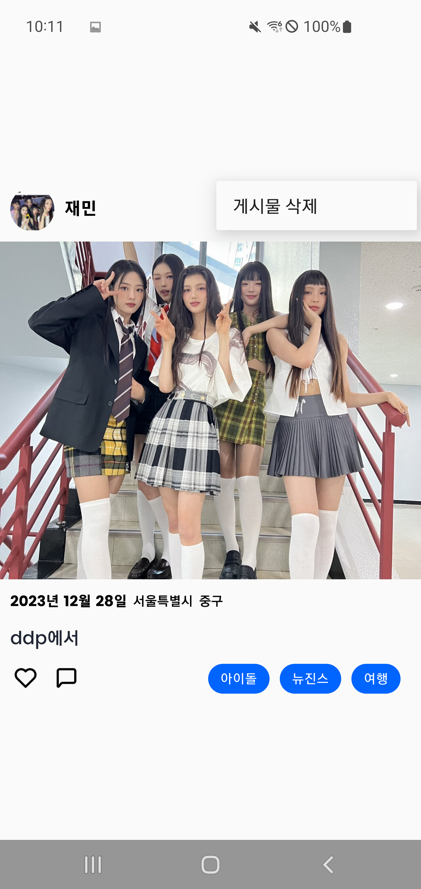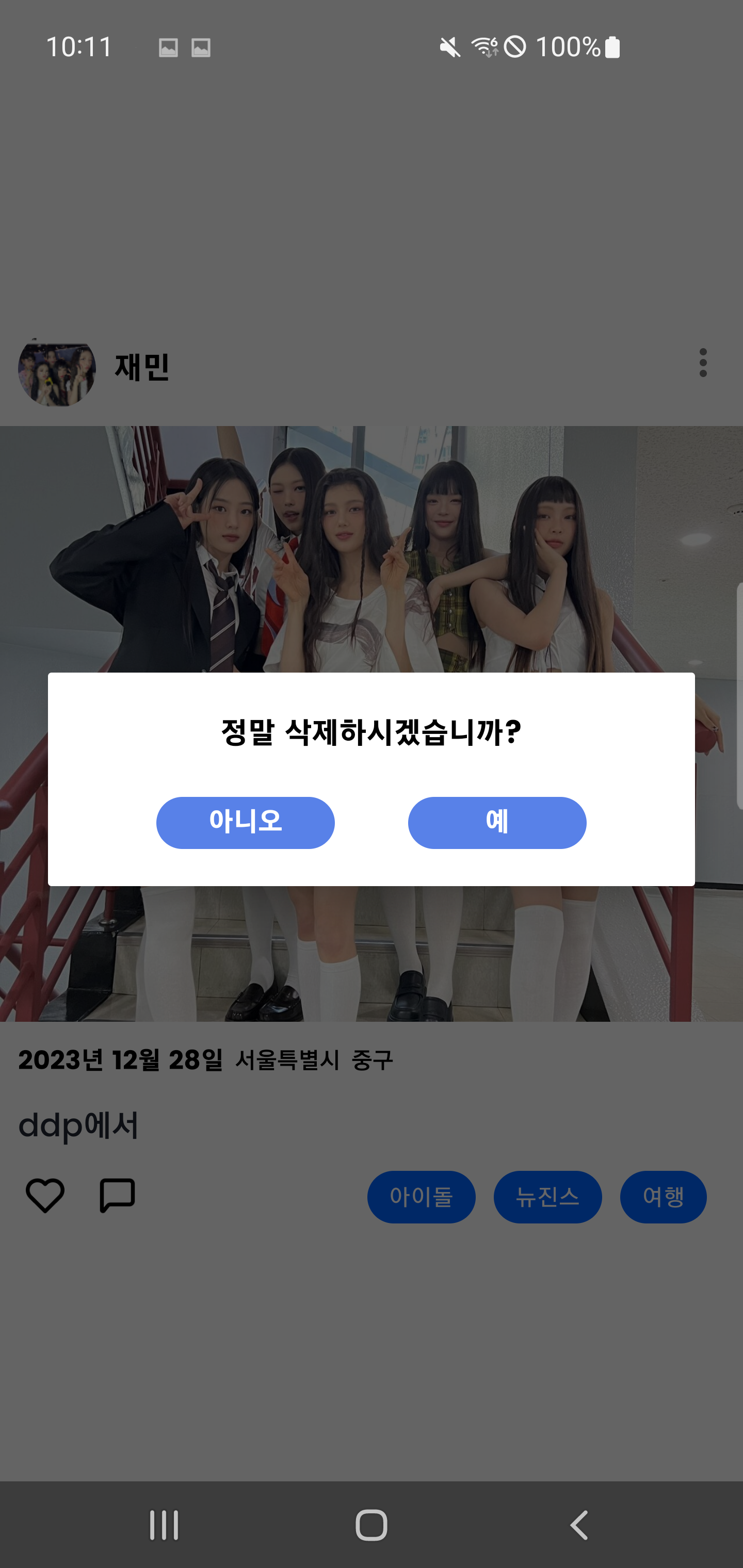 - 게시물에 접근하는 현재 UserId와 게시물을 올린 사람의 UserId를 비교하여 동일하다면 게시물을 삭제할 수 있는 기능도 Menu app bar를 통해 구현하였습니다. 삭제 시 Post 문서 전체와 User 문서 내의 postIds 필드에 있는 해당 postId가 동시에 삭제됩니다.